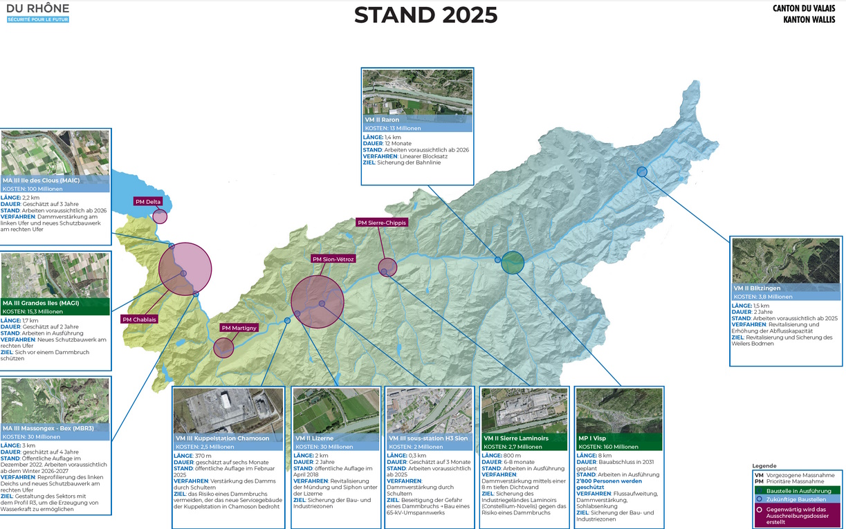 Die Arbeiten an der 3. Rhonekorrektion begannen 2009 in Visp. Entsprechend den Prioritäten, die je nach Gefahrenstufe festgelegt wurden, wurden seither weitere Gebiete entlang des Flusses gesichert oder werden derzeit gesichert.